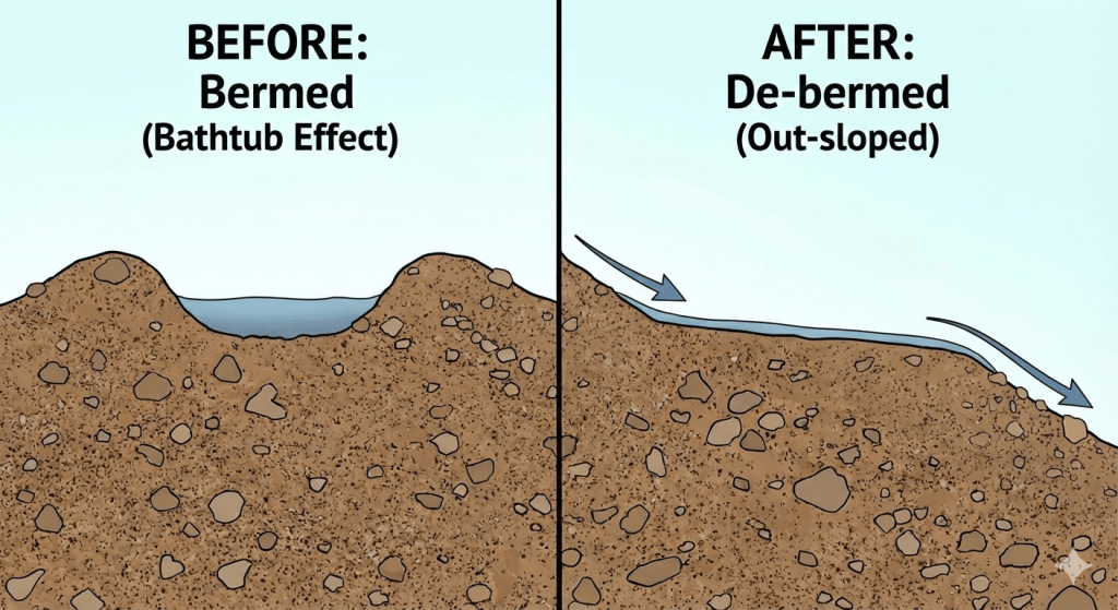 Over time, footsteps and bike tires push dirt to the outer edges of the trail, creating a raised ridge of soil called a “berm.” This artificial dam prevents water from flowing off the side, turning the trail into a canal or a muddy bathtub.