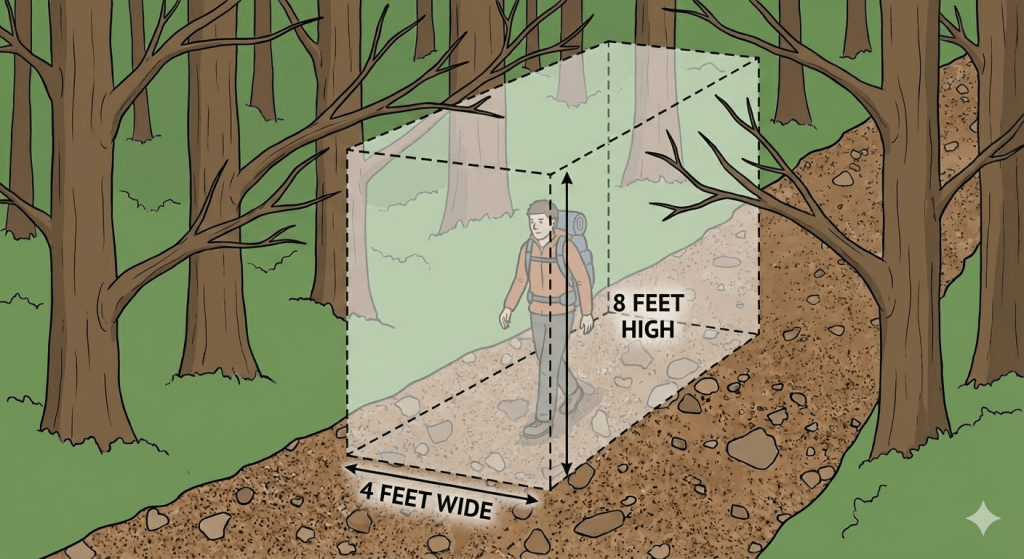 - The Principle: Visualize a clear box: 4 feet wide by 8 feet high. This allows safe passage for hikers, bikers, and equestrians.